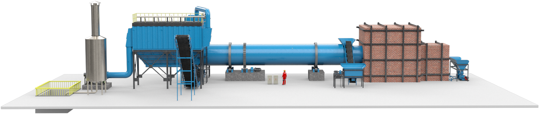 烘干系統主要由熱風爐、上料輸送機、滾筒烘干機、出料輸送機、引風機、旋風除塵器、袋式除塵器(或者濕式除塵器)和操作控制系統構成。設備采用順流干燥工藝,其工作原理如下:濕物料進入干燥滾筒后分以下幾個工作區:一是導料區,瓷泥瓷泥進入此區與高溫熱風接觸迅速蒸發水分, 物料在大導角的導料板抄動下,被導入下一個工作區;二是抄板區,瓷泥瓷泥在此區被抄板抄起形成料幕狀態,此時物料與熱風充分接觸,瓷泥瓷泥中的水分迅速蒸發剝離成為水蒸氣,水蒸氣隨即被引風機抽走,從而達到瓷泥瓷泥干燥的目的;瓷泥瓷泥在此區被干燥成水分小于5%(或者更低)以下的松散狀態,經過熱交換后物料達到所要求的水分狀態,進入最后的出料區;三是出料區,滾筒在此區不設抄板,物料在此區滾動滑行至排料口,完成整個烘干過程。