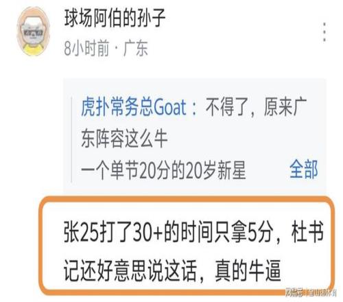 “多年廣東球迷,謝謝杜指導之前的付出,現在可以帶上25離開廣東隊了”;“張25打了30+的時間只拿5分,杜書記還好意思說這話,真的牛逼!”;“家政跟王洪澤快跑吧,這都能在記者會說出來的?”……