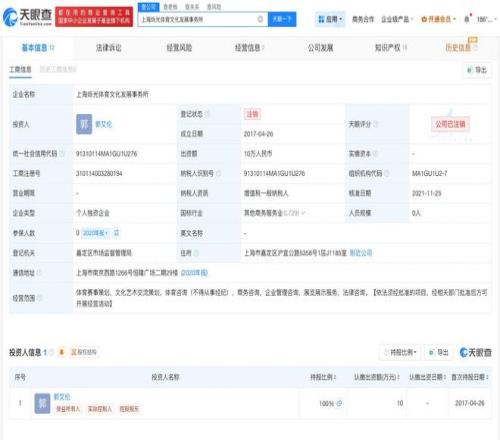 天眼查工商信息顯示,上海爍光體育文化發(fā)展事務所成立于2017年4月,出資額10萬人民幣,經(jīng)營范圍含體育賽事策劃、文化藝術(shù)交流策劃、體育咨詢等,為郭艾倫個人獨資企業(yè)。目前該事務所已注銷。