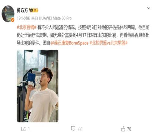 據媒體人勇方方的報道,按照4月3日對趙睿的評估是休戰兩周,他目前仍處于治療恢復期,如無意外需要到4月17日對陣山東的比賽。這樣的消息來看,他下周復出的可能性還是比較大的。