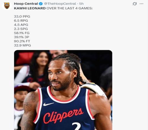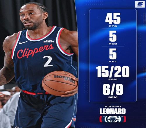 此役倫納德開場就火力全開單節(jié)10中8拿到18分,上半場就拿到28分,全場比賽32分鐘,20中15,三分9中6,罰球10中9,拿到45分5籃板5助攻2搶斷1失誤0犯規(guī),命中率75%,三分命中率66.7%,真實命中率92.2%,正負值+41。