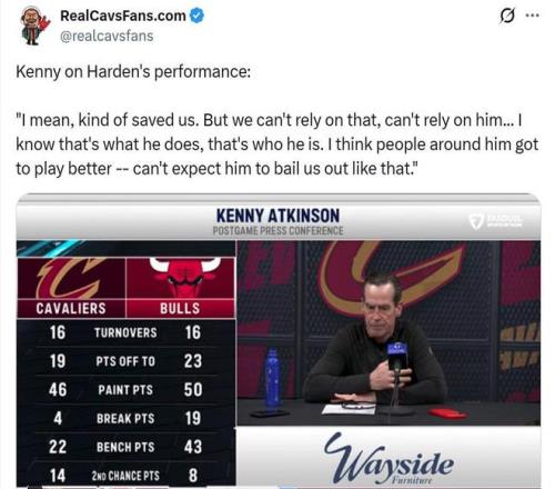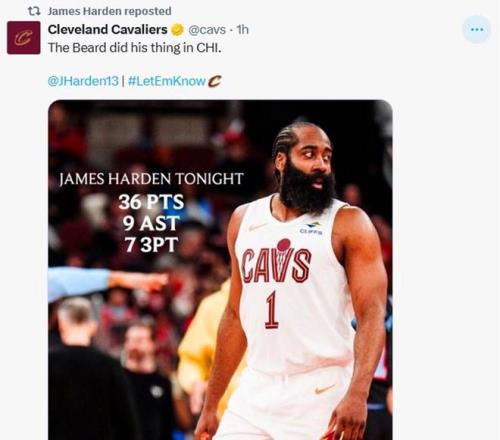 因此哈登也成為騎士隊贏球封面人物,騎士官方賽后專門發(fā)文稱贊到:“大胡子在芝加哥大顯身手。”