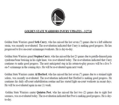 斯蒂芬-庫里因右膝髕股疼痛綜合征+骨挫傷已連續缺陣23場,今日接受復查。結果顯示他恢復情況持續向好,復出流程的下一步預計是在未來幾天參加5對5全場對抗訓練,并將于下周再次接受復查。