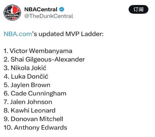 特別值得一提的是,NBA官方公布了最新的MVP排行榜,文班亞馬登頂榜首,亞歷山大下滑至第二,約基奇第三緊隨其后,東契奇第四。