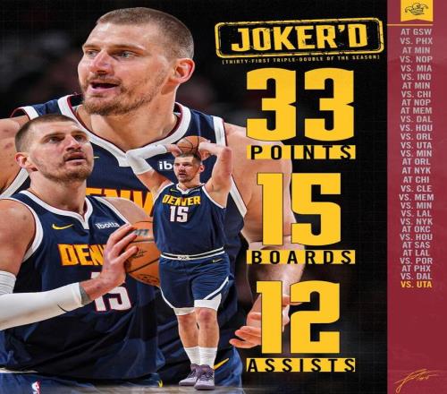 數(shù)據(jù)統(tǒng)計(jì),約基奇只要在這七場比賽里送出20次助攻,就能達(dá)成賽季場均三雙的偉大數(shù)據(jù)。