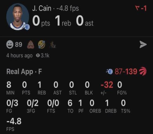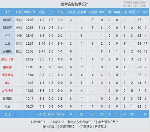 魔術上半場出現18次失誤,全場27次失誤創球隊賽季新高,此前紀錄是24次。魔術狀元班凱羅出戰30分鐘,投籃14中3,三分5中0,罰球4中3,拿到9分5板3助5失誤,正負值-30。替補球員凱恩出戰8分27秒,3中0拿到0分6失誤,正負值-32!