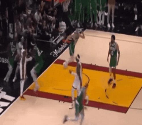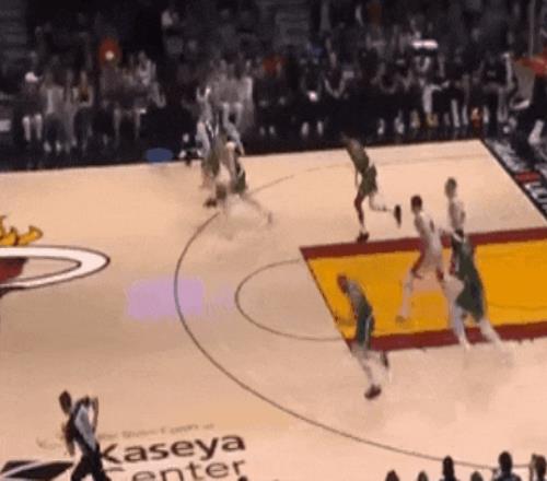 懷特拋傳空接后,立刻回身,第二個沖刺跑:邁阿密反擊,拉爾森想偷個壓哨上籃,被懷特回追干擾掉。