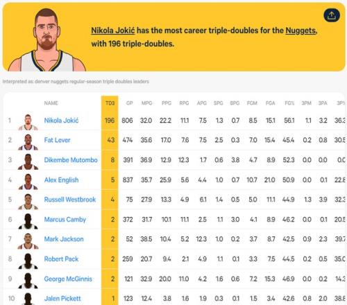 2.約基奇拿到生涯第196次三雙隊史第一,掘金隊史前十的三雙次數加起來都只是他的零頭;