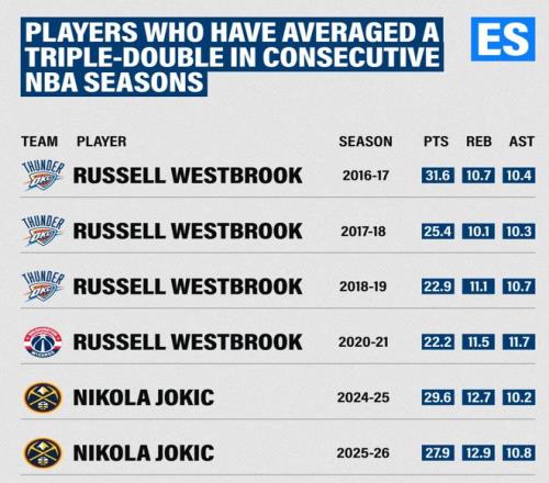 5.約基奇連續兩個賽季提前鎖定三雙,比肩威少;
