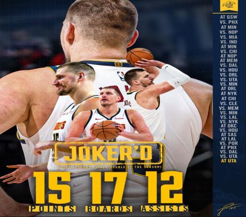 約基奇在過去的6場比賽中拿到了5次三雙,只有在對陣勇士的比賽中差2個助攻,不然他就是六連三雙,約基奇的能力實在是太強了。對陣爵士的比賽后約基奇又創造多項紀錄。