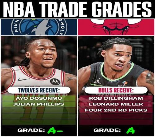 回頭看看交易截止日那天,森林狼做了什么。他們打包迪林厄姆、倫納德-米勒和4個次輪簽,6換2從公牛得到多森姆和菲利普斯。迪林厄姆是2024年8號秀,場均3.5分;米勒場均2.3分。