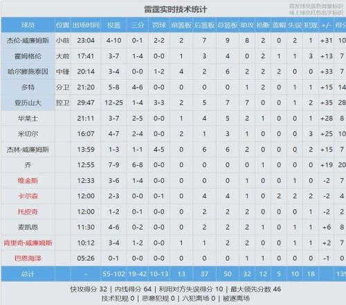 第二節(jié)雷霆再轟38分,半場打完,雷霆82-51領(lǐng)先湖人31分。里夫斯7中5拿到14分4失誤,東契奇9中2得到10分4板5助4失誤,詹姆斯3中1拿到8分3板2助2失誤。湖人上半場罰球18中15,三分16中4;雷霆罰球10中9,三分19中9。