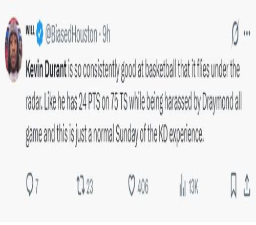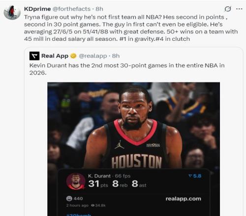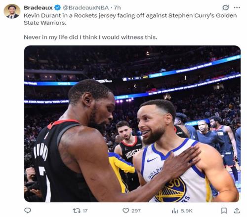 休媒Bradeaux寫道:從未想過有一天杜蘭特穿上火箭球衣與斯蒂芬-庫里競爭。這場比賽后杜蘭特已經拿到第28次30+,這是他最近10個賽季最多的一次,也就是37歲的他比肩了27歲的他。