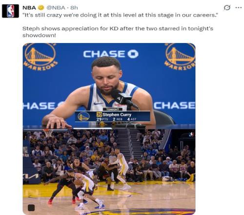 庫里在賽后也盛贊了杜蘭特保持了超高的競技狀態,很高興我們在生涯的這個階段還能有這樣的水準,這實在是太瘋狂了。