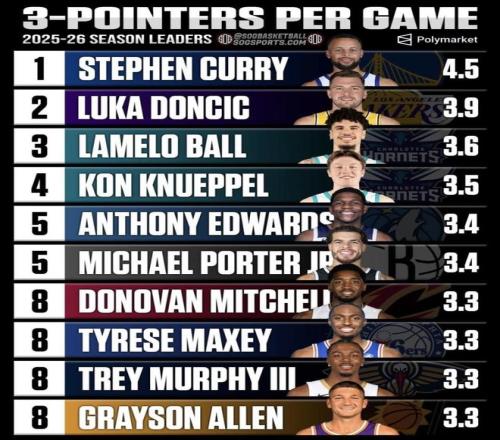 這份榜單最有意思的地方,不在于誰擠進了前十,而在于第一名和后面那串人的差距到底有多離譜。庫里場均投進4.5記三分排在榜首,表面上看只比東契奇多了0.6個,但結合命中率和出手量來看,這0.6個的含金量極高。庫里這賽季場均在三分線外出手11.5次,命中率依然硬生生維持在39.1%,同時還能交出27.2分的場均成績單。這絕不是靠無限開火權堆出來的數字,而是在全聯盟最頂級的防守包夾下,依然能把產出和效率同時鎖死。38歲還能保持這種輸出體量,庫里依然是這個聯盟里最恐怖的外線核武。