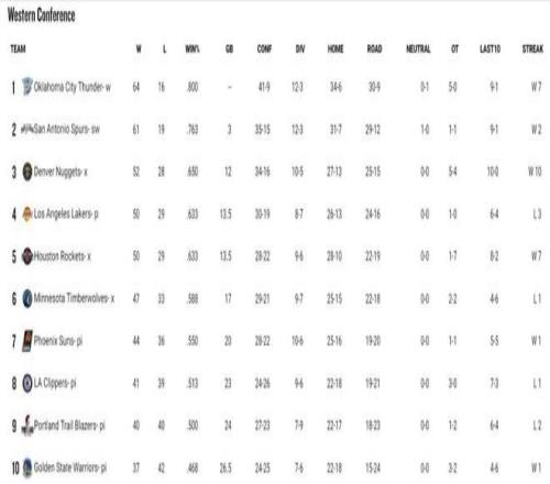 西部形勢日趨明朗:雷霆鎖定第1+馬刺第2,森林狼太陽排名確定
