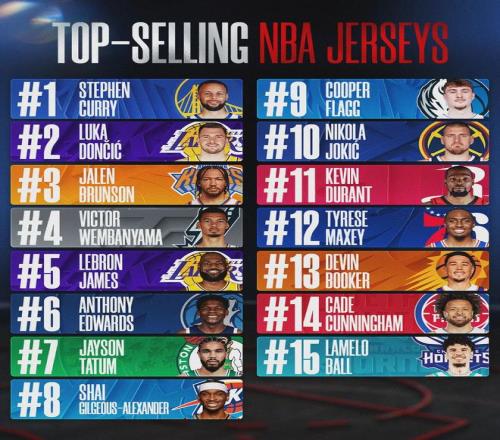 今天NBA官方曬出本賽季球衣銷量,庫里高居第一,東契奇位列第二,布倫森排名第三。塔圖姆缺席大半個賽季,依然能排名第七,獨行俠狀元弗拉格排名第九。值得一提的是,榜單上的華子和坎寧安等人都失去了最佳陣容的評獎資格。