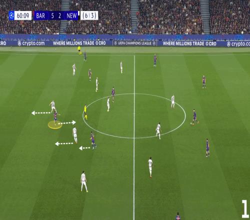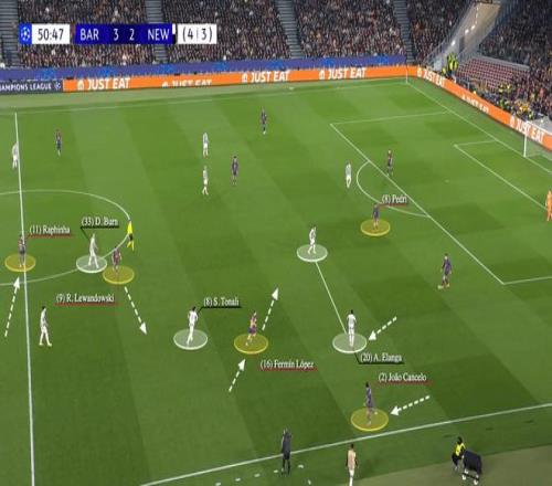 周三對陣紐卡一役,巴薩也采用了同款戰術拆解對手防線。