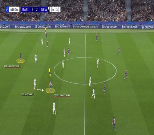 巴薩的第六粒進球,更是將紐卡防線攪得混亂不堪。馬丁觀察進攻選擇時,萊萬再度深度回撤,這次蒂奧切換防守目標盯防波蘭前鋒;處于越位位置的亞馬爾舉手要球,吸引了伯恩的注意力。