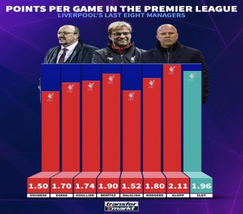 斯洛特場均 1.96分,按這張榜單就是第二,這一點不用改。可他這一欄最值得寫的,不是“第二高不高”,而是數字和最近比賽內容反差很大。2024年剛接手時,他接的是克洛普留下來的成熟班底,外界當時就提到,他只補進了費代里科·基耶薩一名新援,更多是在現有框架上接著帶。可到了最近這段,利物浦先是在歐冠16強首回合 0比1輸給加拉塔薩雷,接著聯賽主場 1比1被熱刺絕平;路透社還寫到,利物浦本賽季已經多次在75分鐘后丟球,熱刺這場更是第90分鐘丟掉兩分。也就是說,斯洛特這1.96分說明他前面的聯賽拿分效率確實高,但最近這段球隊的比賽內容和外部觀感,已經不是這列數字能直接蓋住的了。