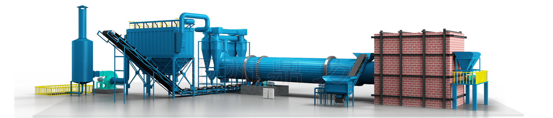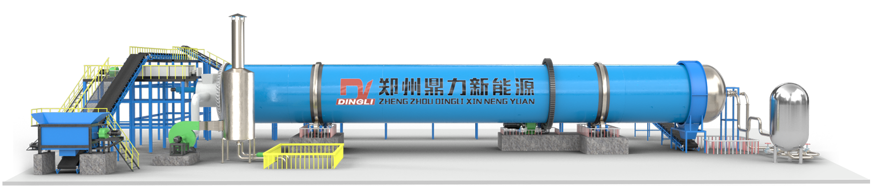 鼎力蒸汽煤泥烘干機主要由熱源、喂料裝置、帶式上料機、回轉滾筒、帶式出料機、引風機、除塵器和配電柜構成。